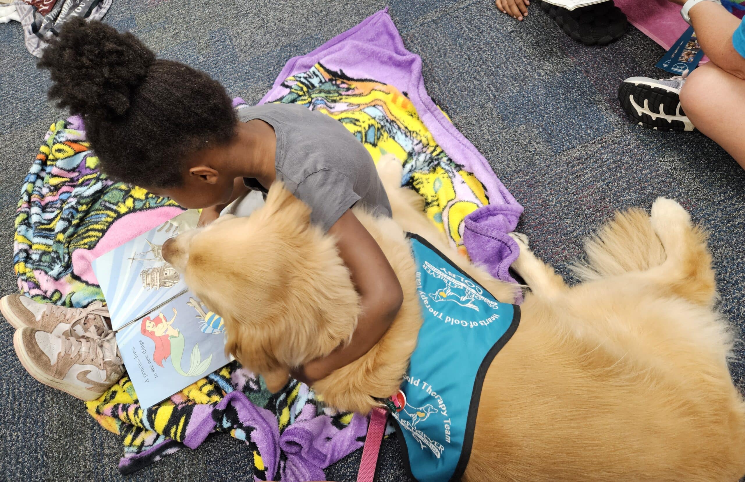 A Hearts of Gold therapy dog is laying on the ground with a young child on a blanket. The child has her arm wrapped around the dog while they read The Little Mermaid book together.
