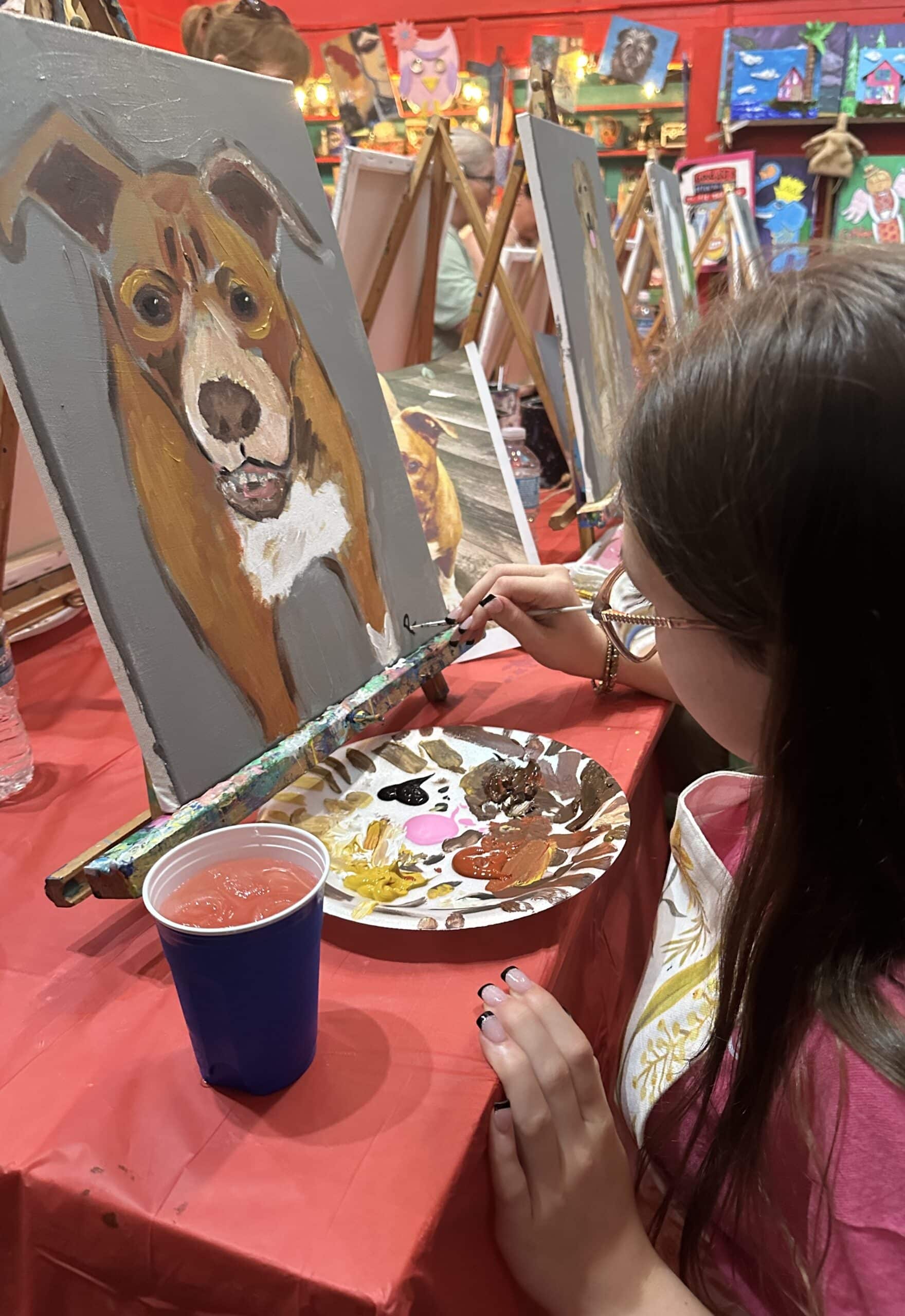 A woman painting a portrait of a brown and white dog, with a paint palette and water cup on a red table.