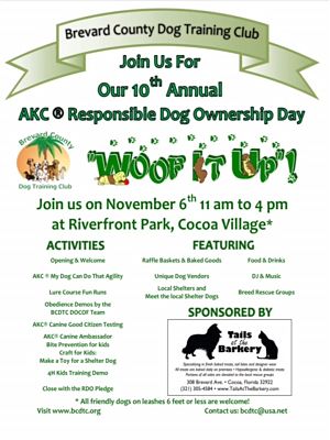 Please join us for the 10th Annual Woof It Up — AKC Responsible Dog Ownership Day, in Riverfront Park, Cocoa Village, sponsored this year by Tails at the Barkery.
