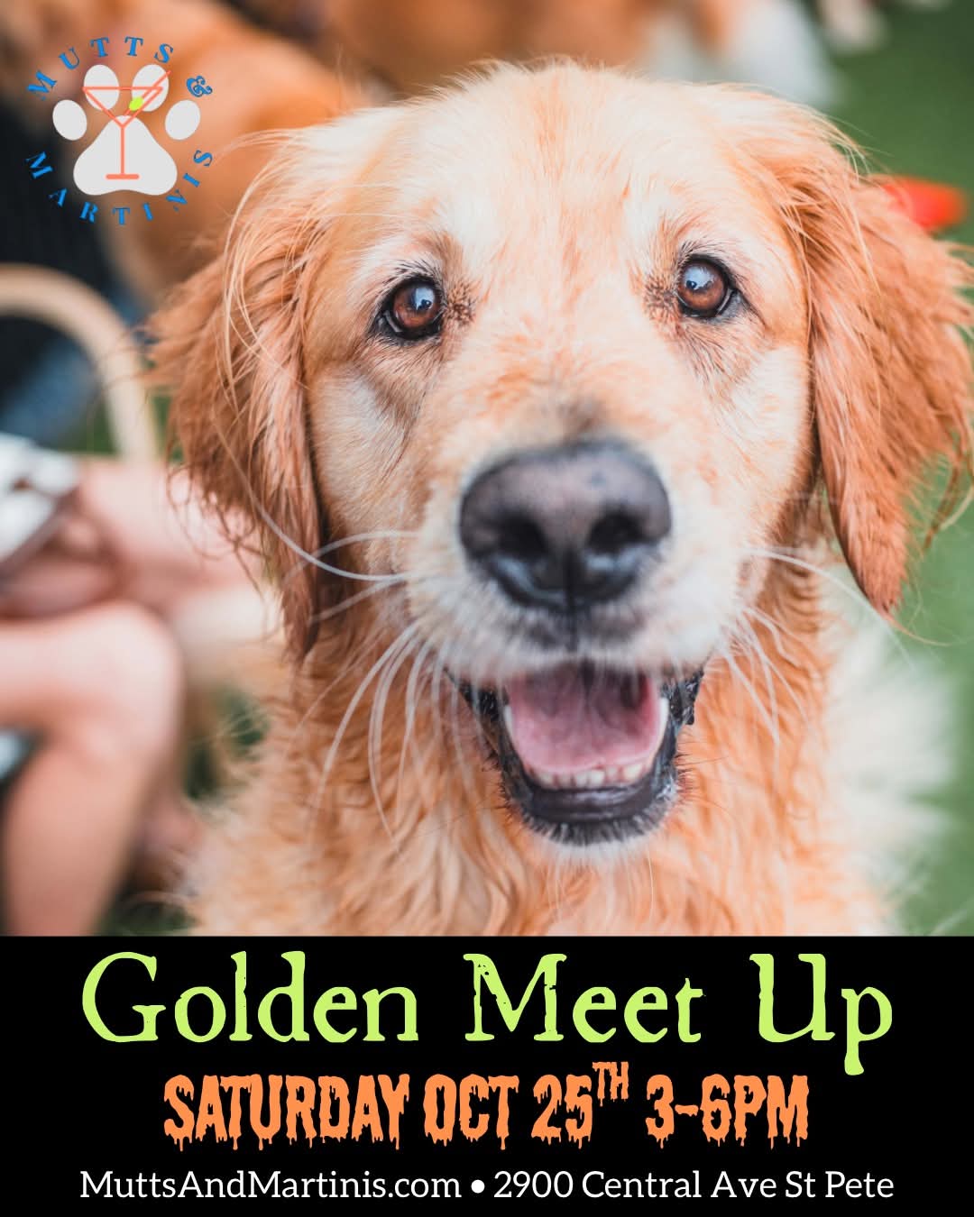 Close-up of a golden retriever's face with text announcing a "Golden Meet Up" on Saturday, October 25th.