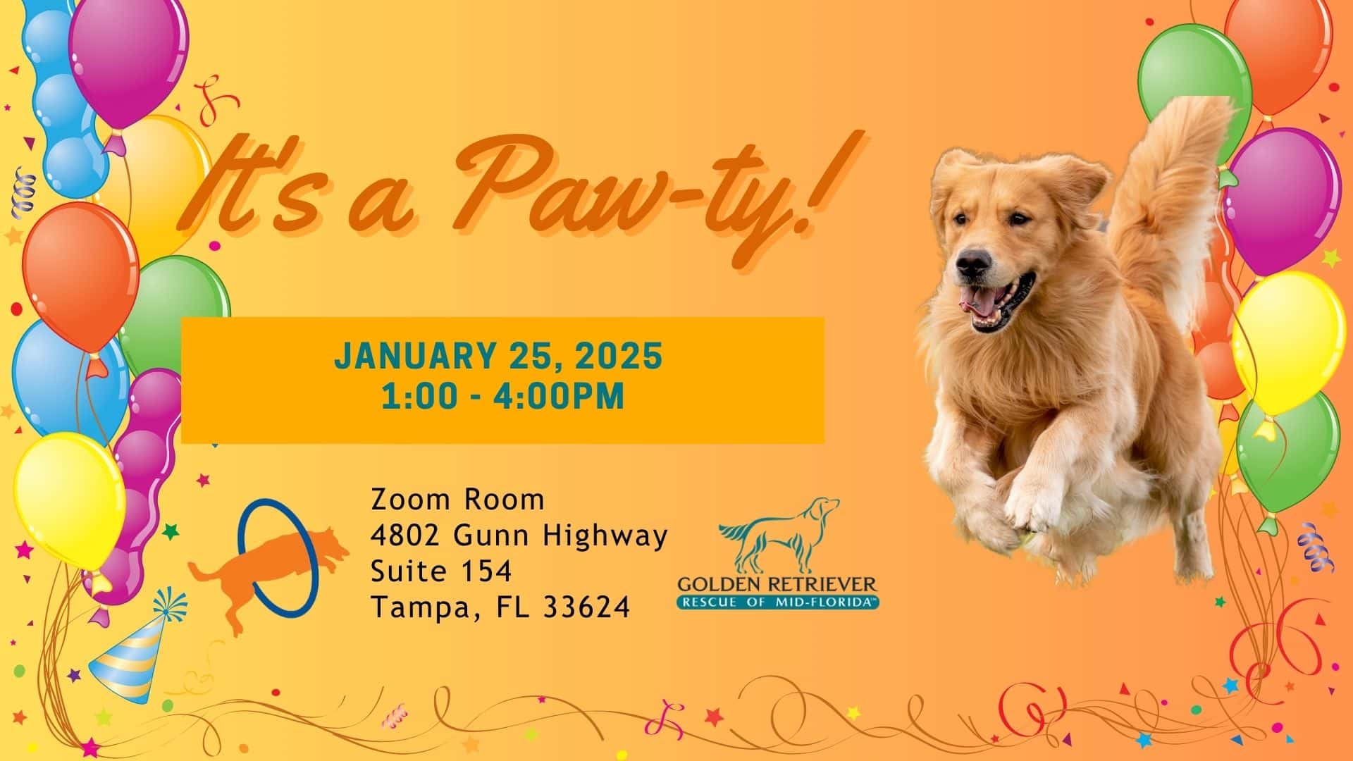 Orange flyer for Zoom Room dog event on January 25, 2025, promoting a “Paw-ty” at Tampa, Florida location.