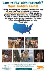 Calling all pilots who LOVE to fly and help save the lives of goldens in need. We have golden rescue partners throughout the US who make us aware of goldens in their areas that they cannot save due to limited space in their rescues. We are starting an out of state “transportation station” to help bring these goldens into Florida. Sometimes we hear about less than 10 dogs and times there can be more!