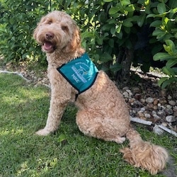 Doodle sitting on grass wearing a teal Hearts of Gold vest.