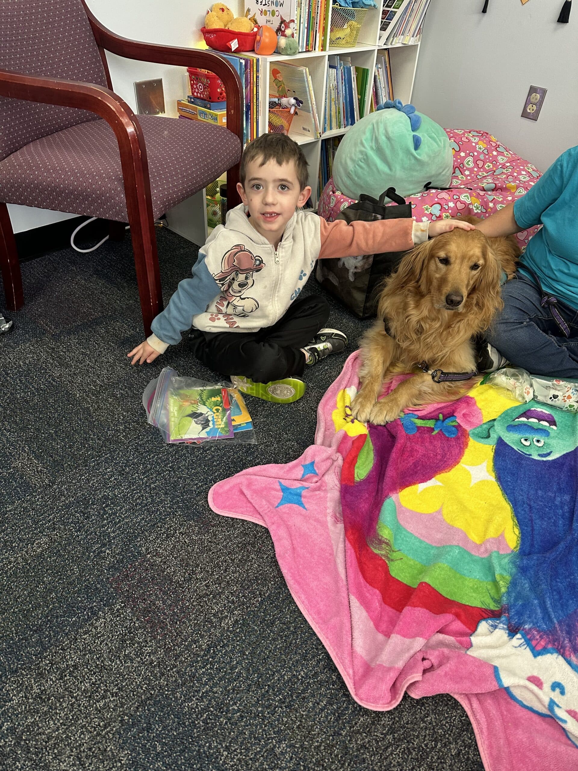 Golden retriever lying on a colorful blanket while a child sitting on the floor pets its head.