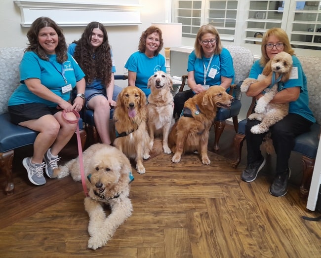 The Hearts of Gold therapy pups are thrilled to be considered VIPs–very important pups–wherever they visit. Just look at the video below to see the love and attention these well-trained and gentle pups received from the residents of Fountains of Melbourne. In return, the pups consider all their new friends VIPs as well–very important paw-sons–as easily seen by the pups’ smiles and wagging tails. What a fun get-together for all!