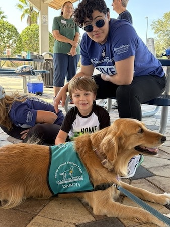 Golden retriever called "Dakota" wearing a Hearts of Gold vest lying on a tiled floor near a person and a child.
