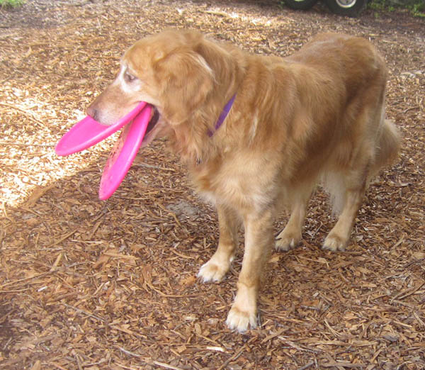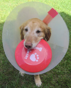 Miley got a chance to sport an E-collar when she scratched herself raw from a bug bite. She walked around proudly showing off her new hat and actually found it to be very resourceful for carrying her favorite ball and frisbee