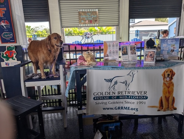 A golden retriever standing on a tall chair next to an informational booth. A banner for GRRMF is attached to the table.