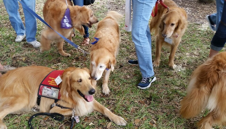 close up of goldens mingling