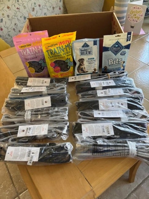 Bags of dog treats and leashes.