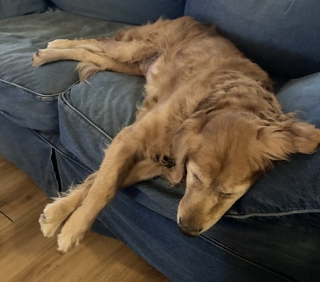 An adult golden retriever sprawled out napping on a large, fluffy couch. The dog's cheek is smooshed and its ear is draped over a pillow.
