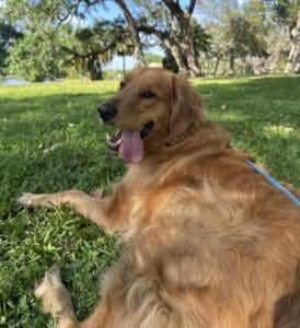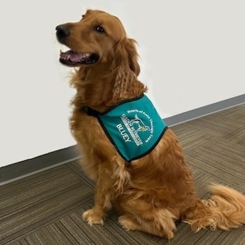 He also enjoys visiting the library, where the kids lay on him while he listens to them reading. Bluey loves cuddling, playing with toys and hiking as well as walks in the park.