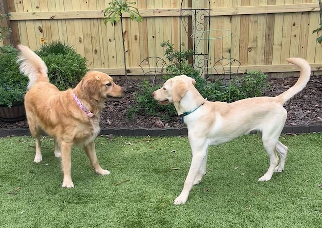 Two adult retrievers, standing outside, looking at each other