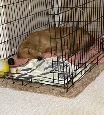Golden Retriever sleeping curled up inside a crate with a towel and blanket, looking peaceful and secure.