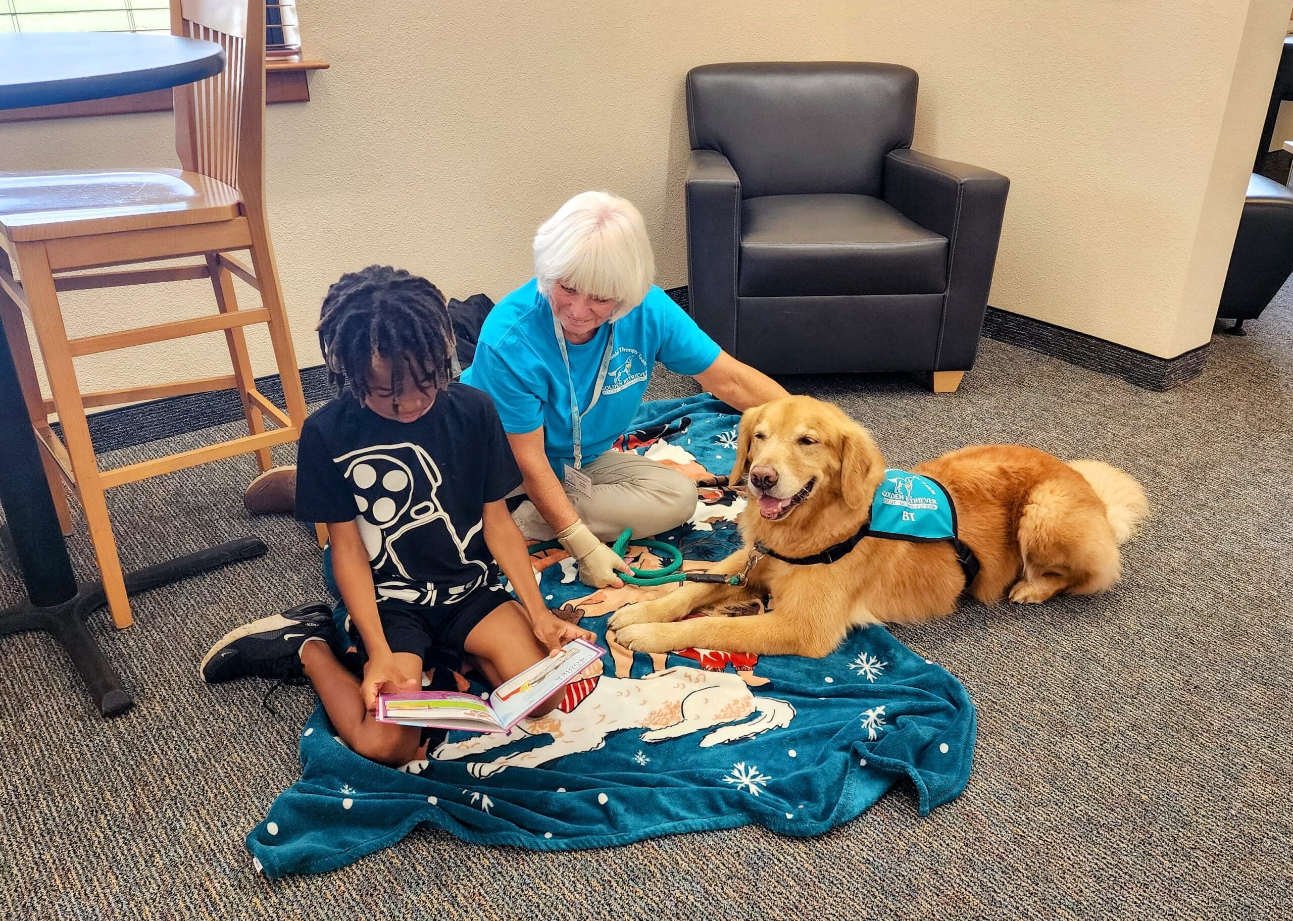 This seasoned team visits libraries, retirement homes, colleges, group homes and schools, and attends special community events. Jan, however, is particularly partial to their college visits at exam time when the students are so understandably stressed. She watches them relax as they love on BT and smiles as BT readily returns their love.