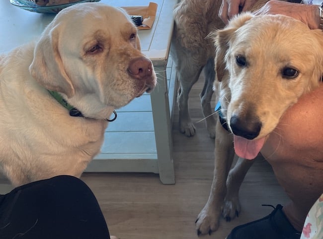 Two retrievers one looking away the other one, also looking away, but standing with head on persons leg