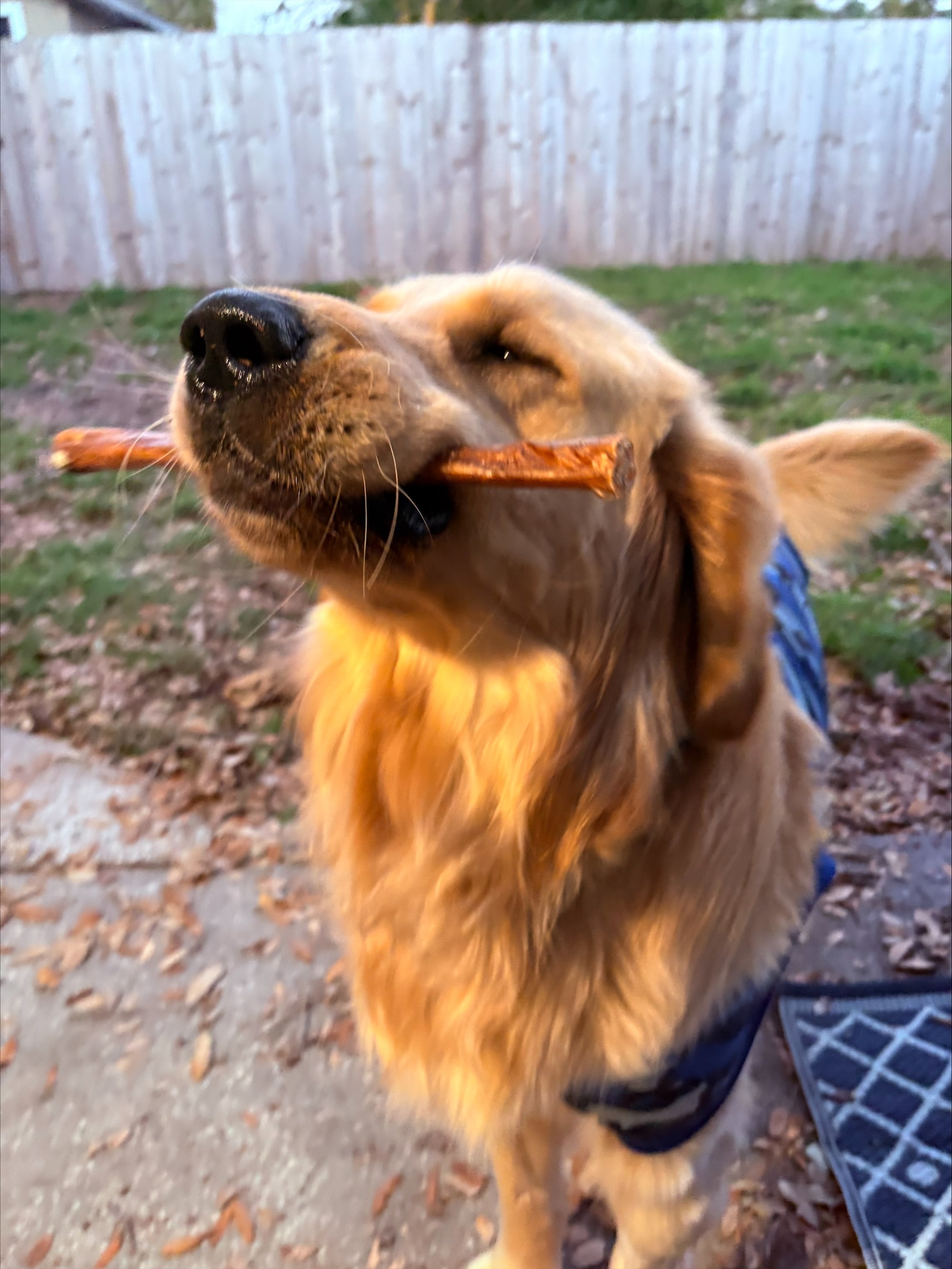 A proud golden with a treat in its mouth.