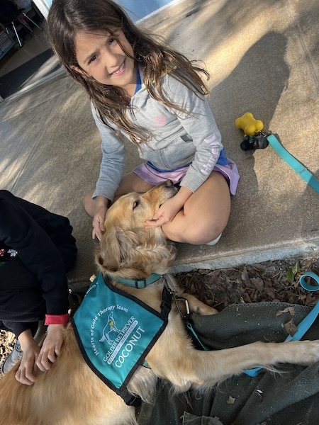 Golden retriever named Coconut wearing a Hearts of Gold vest lying outdoors on a blanket next to a child.
