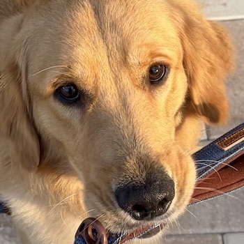Dog looking at camera with leash in his mouth waiting to go for a walk