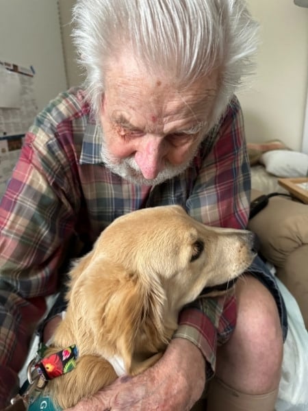 Elderly man gently holding a golden retriever indoors, sharing a tender moment.
