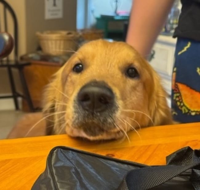 A golden retriever is resting its head on the table making direct eye contact with the camera.
