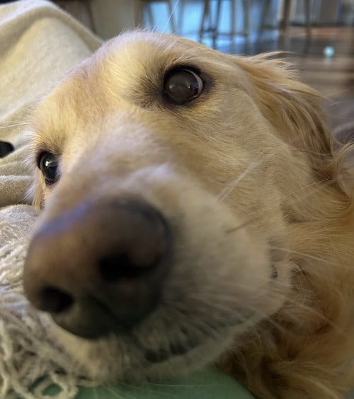 A close-up, wide-angle shot of a golden retriever's face.