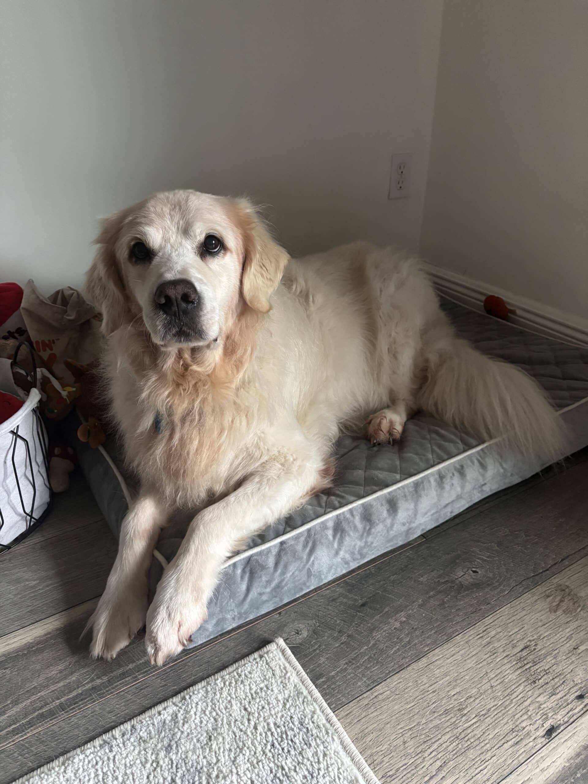 Jax truly loves people. He’ll gently nudge your hand or tap you with his paw which is his polite way of requesting pets and belly rubs. He enjoys snuggles but isn’t a Velcro dog. He’s perfectly happy curling up on his dog bed while you relax nearby. He enjoys spending time together but not being overly clingy.
