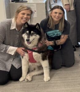 Juno likes every therapy facility she and Carrie visit because they all involve petting! The team regularly visits hospitals, children’s foster homes, reading with children, Memory Care facilities, teen therapy programs and Ronald McDonald House. Her greatest delight, though, is when she recognizes people at a facility and they recognize her: she wiggles with excitement and sometimes gives her friends a little Husky “hello.”