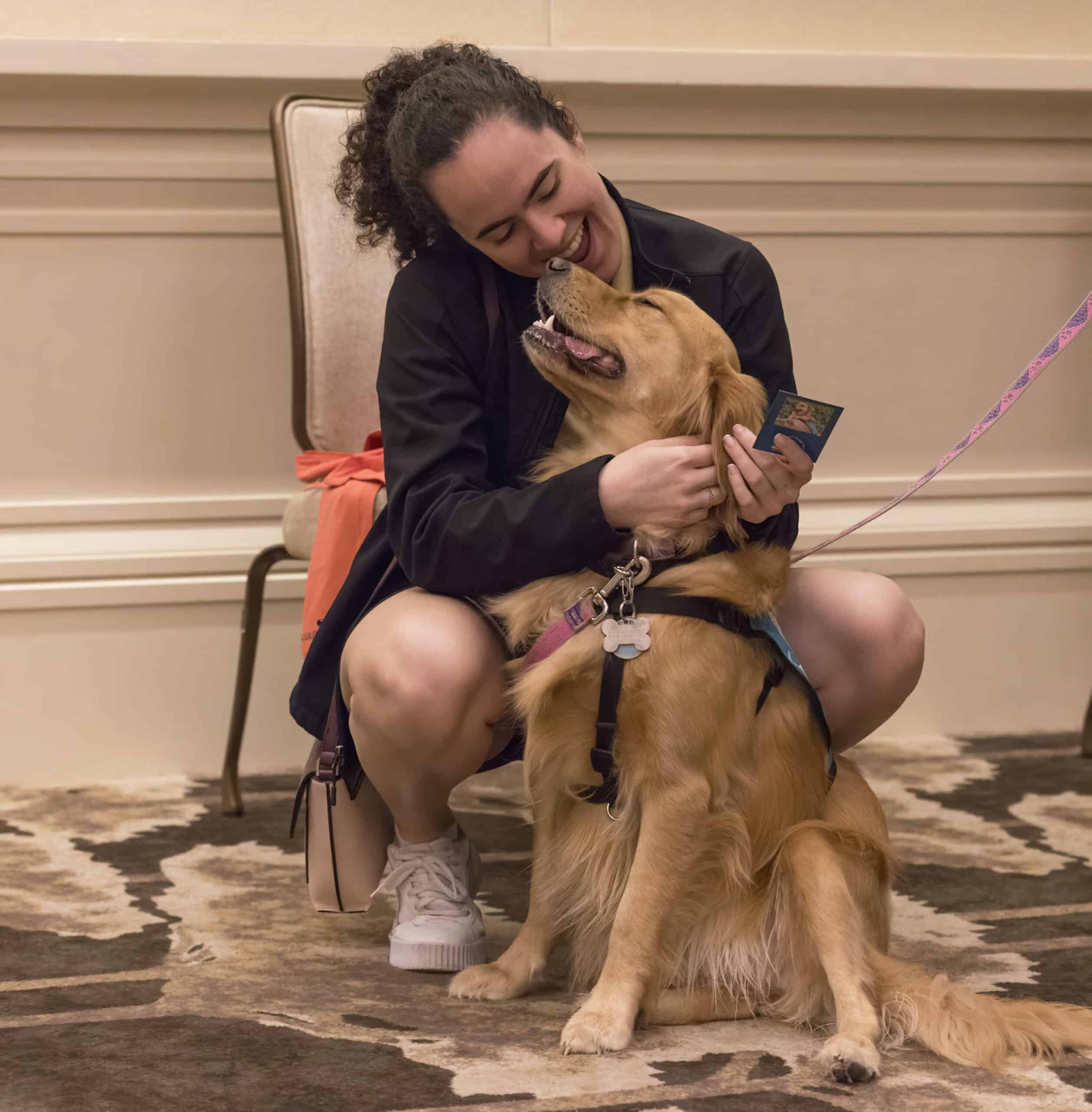 A woman crouching down to hug a smiling golden retriever wearing a Hearts of Gold vest.