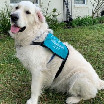 One of Ozzy’s most endearing habits that melts David’s heart is how much he loves putting his chin on his lap. Not to mention that this fashion-forward Golden likes jauntily sporting a hat on his handsome head! Ozzy has a “baby” brother, a Great Dane he wrestles with all the time that David hopes to certify next year. His ultimate dream is to bring both dogs and his wife on their various Therapy visits.