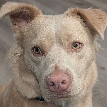 Close-up of a light tan dog’s face with a pink nose and one ear perked up, looking at the camera indoors.