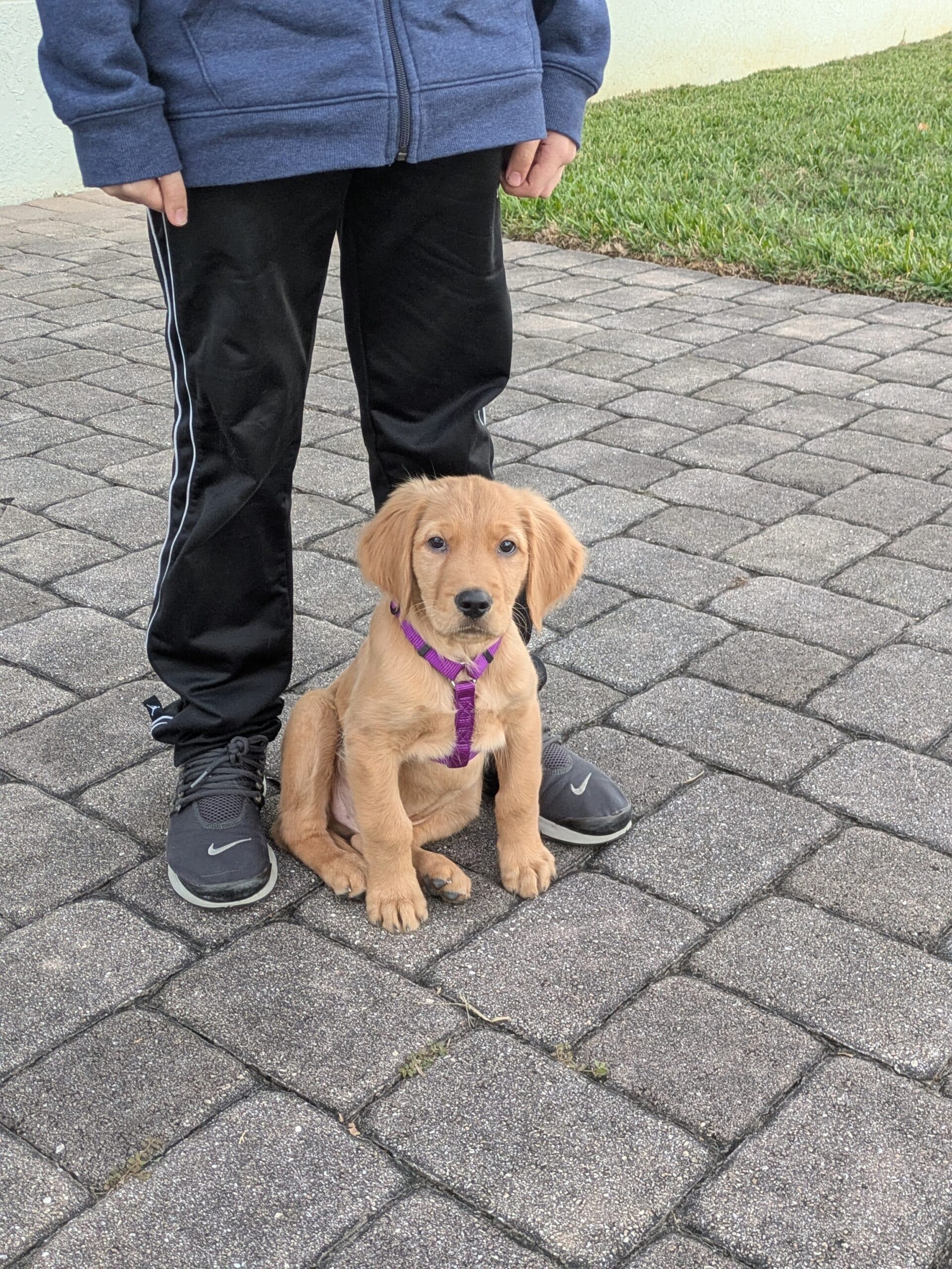Golden puppy wearing a purple harness sitting on a stone walkway next to a person’s legs.