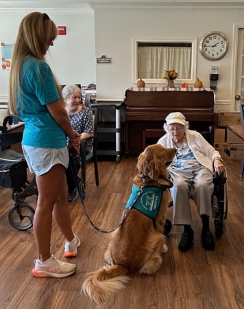 A Hearts of Gold volunteer is with her therapy dog at a nursing home. The dog is wearing the distinctive blue vest with the HoG logo, as a resident in a wheel chair is petting it. Another resident in the background smiles at the scene.