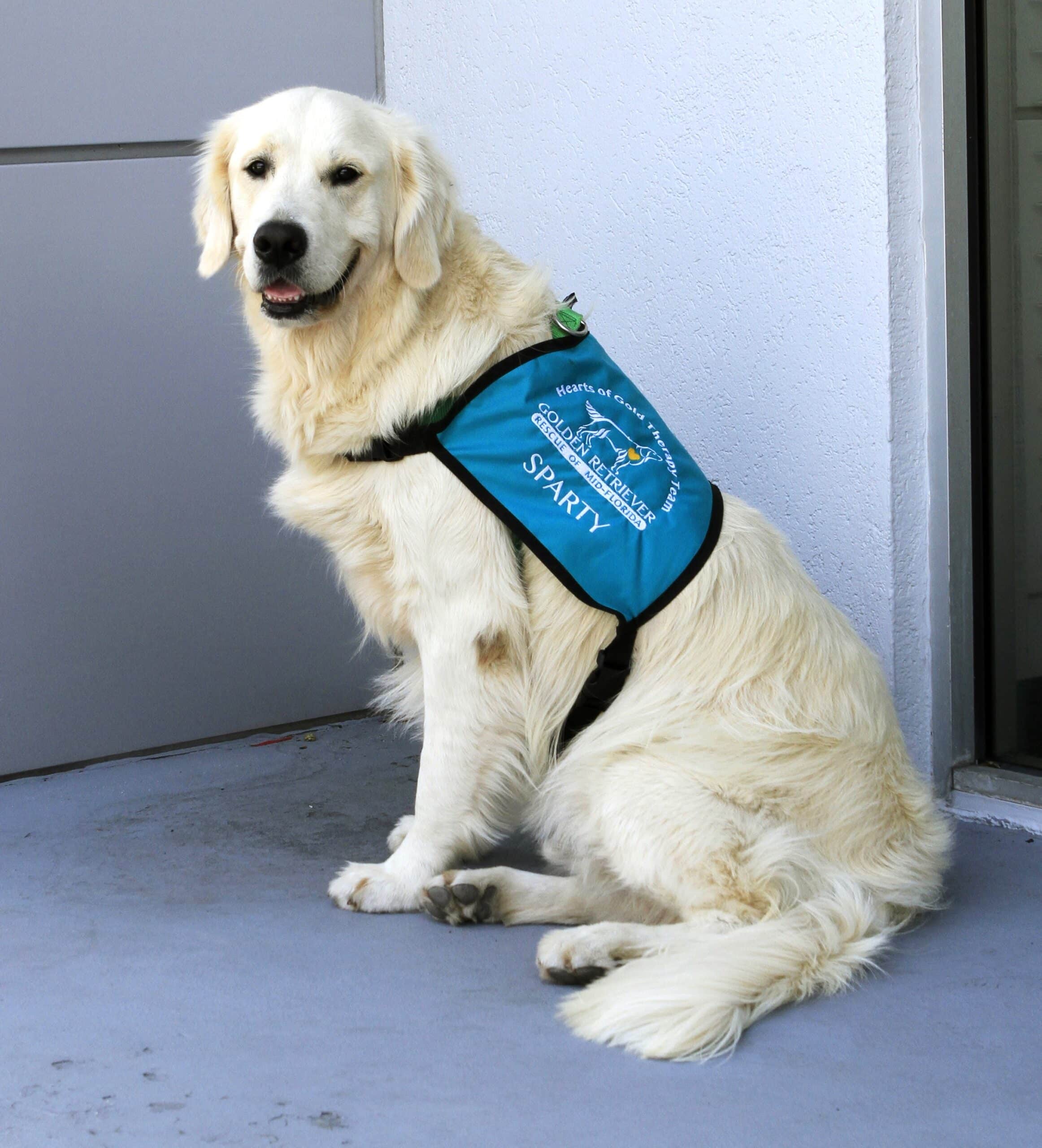 Golden retriever called Sparty sitting, wearing at Hearts of Gold vest.