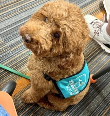 Sugar and Dalia have visited senior living facilities and attended library visits. Given small, sweet Sugar’s curly, deep red coat and soft, warm eyes, this calm and cuddly cutie was, quite simply, born for therapy work.