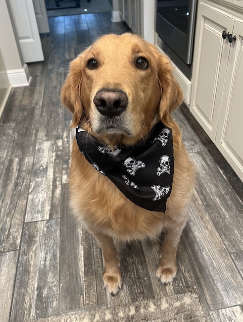Adult retriever, sitting, looking at the camera with a black skull bandana around neck