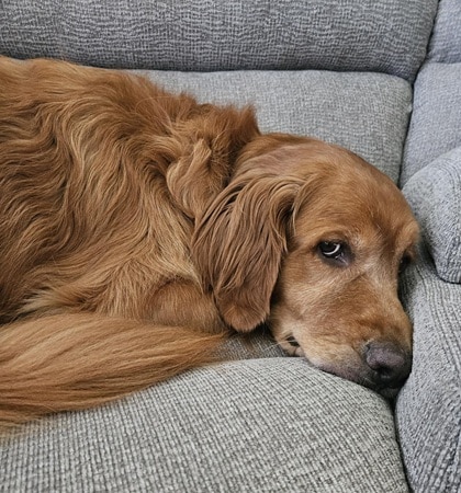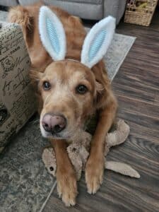 Invariably making his mom laugh is the way Atlas thinks of his large coppery-golden self as a small lap dog. Not to mention what a good sport he is about, e.g., donning a pair of pale blue velvet bunny ears for Easter,