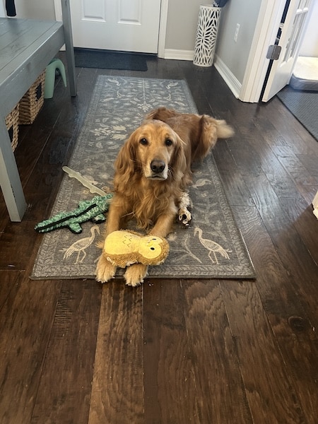Gadget is just a complete sweetie. He loves his stuffed toys but will happily share them with Blaze. He gently greets other people and dogs. Yet, Gadget also has some pretty fun habits. For example, he has a certain way of sitting on his haunches to beg for attention and pets that provides no end of amusement for his parents. Gadget is also incredibly good-natured about getting dressed up for holidays who doesn’t love a golden with rabbit ears?
