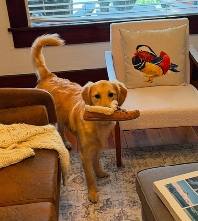 Purebred Golden Retriever indoors holding a shoe in its mouth, standing near a decorated chair.