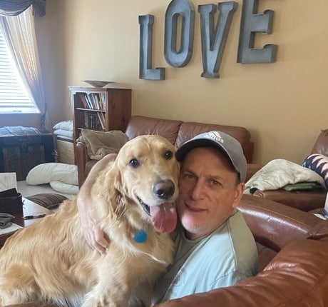 A golden and man are sitting on a leather couch. The man's arm is wrapped around the golden, the golden has a big smile with tongue out.