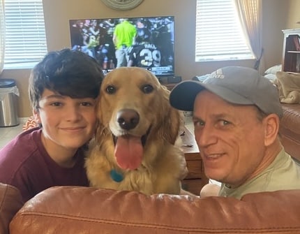A boy, a golden, and a man sitting on the couch. They're taking a break from watching football on tv to pose for a photo.