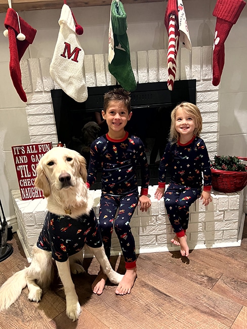 Two kids sitting by a fireplace and wearing matching holiday pajamas with their golden.