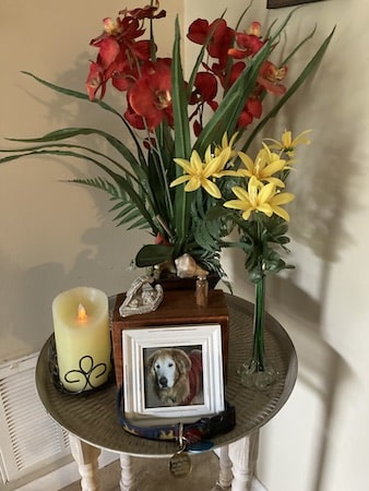 From Ellen. “One dog, Shake, stole my heart. I thought he was the cutest, elderly gentleman with the look of a fuzzy polar bear. Before he was placed in Sanctuary, I was seriously thinking of adopting him. When I found out Sherry and her husband were going to keep him, I was so happy and relieved that he would be staying in their loving home with Angel and Macie Rose, their Shih Tzu blend. Sherry always kept a candle lit for 30 days near a picture of her precious GRRMF babies that had crossed the bridge.”